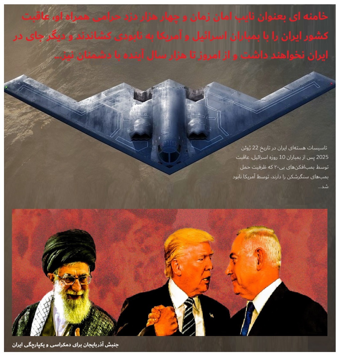 تیر ۱, ۱۴۰۴لعنت خدا بر ولی فقیه، حکومت و حامیان او باد. پس از اسرائیل، آمریکا نیز وارد …